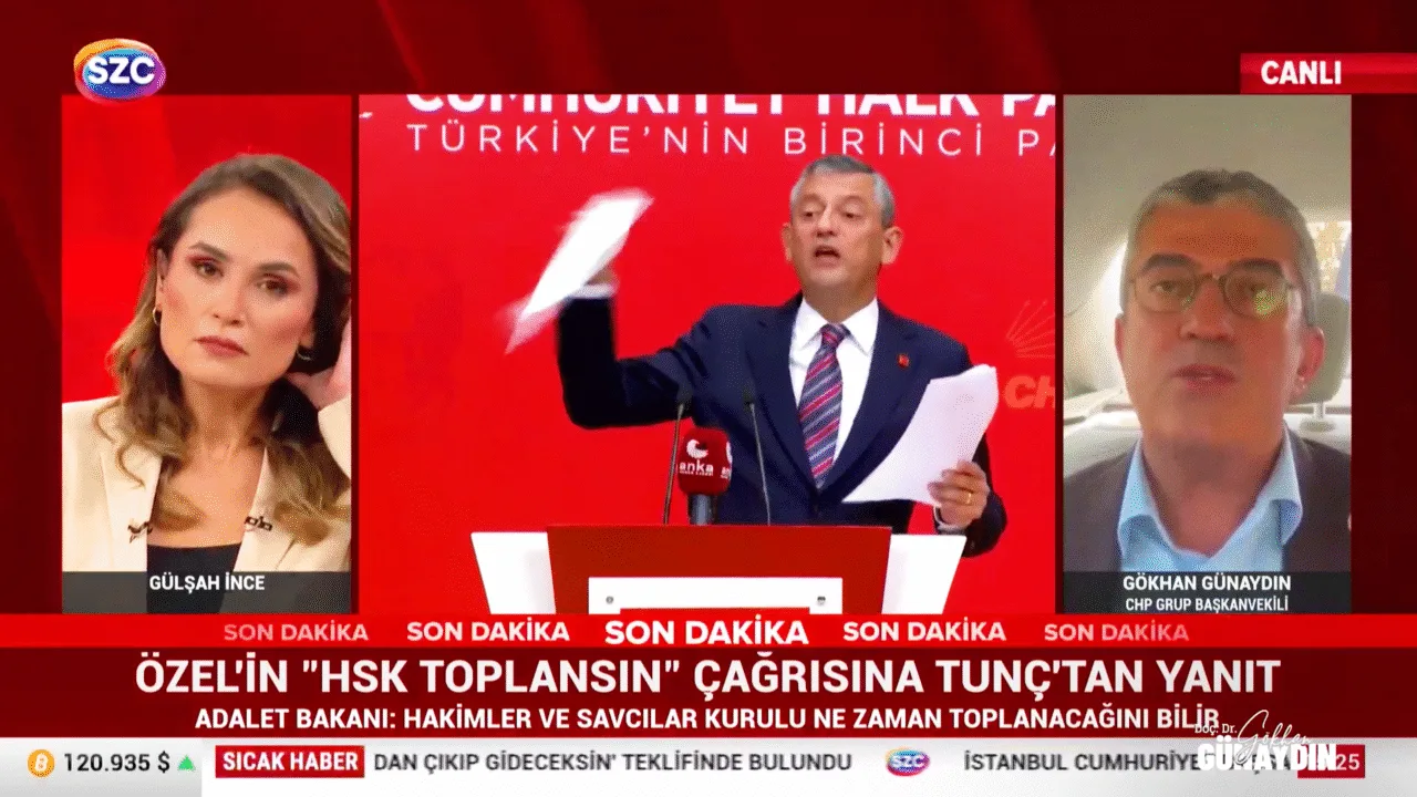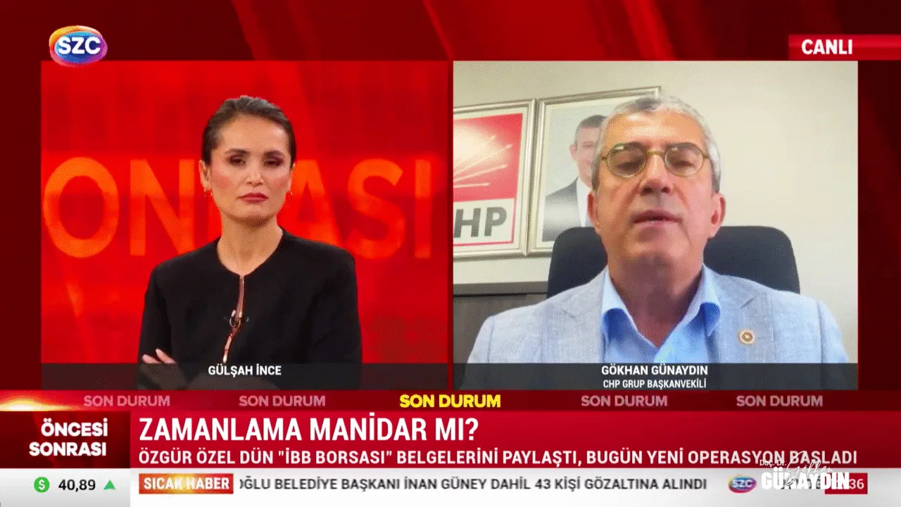CHP Grup Başkanvekili Gökhan Günaydın, SZC TV’de Uğur Dündar ile Arena programına katılarak Suat Toktaş, Kürşad Oğuz ve Barış Pehlivan hakkında çıkartılan tutuklama talebini, Ekrem İmamoğlu’nun düzenlemiş olduğu basın toplantısını ve İmamoğlu’nun açıkladığı bilirkişi Satılmış B. hakkındaki iddiaları değerlendirdi.
