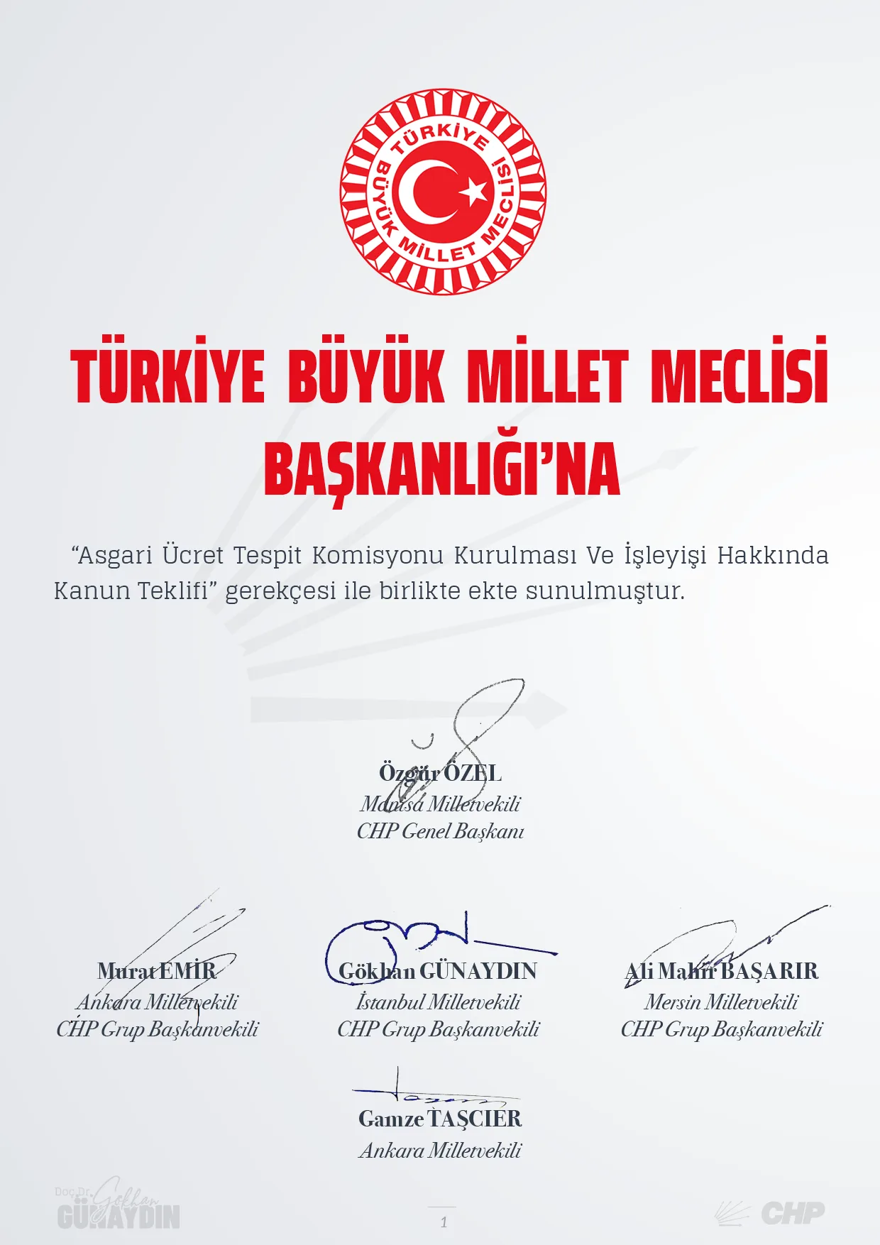 CHP Genel Başkanı Özgür Özel, Grup Başkanvekilleri Gökhan Günaydın, Murat Emir, Ali Mahir Başarır ve Ankara Milletvekili Gamze Taşcıer imzasıyla “Asgari Ücret Tespit Komisyonu Kurulması ve İşleyişi Hakkında Kanun Teklifi” TBMM Başkanlığı’na sunuldu. Teklif, asgari ücretin belirlenme yöntemini kökten değiştirerek, ücretin sadece işçiyi değil ailesini de kapsayacak şekilde hesaplanmasını ve komisyon yapısının demokratikleştirilmesini öngörüyor.