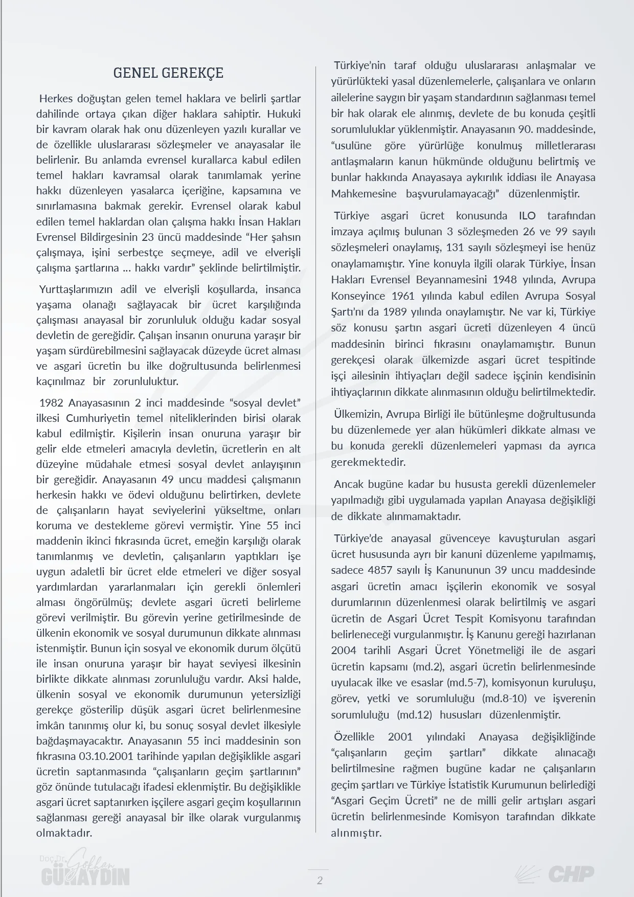 Yurttaşlarımızın adil ve elverişli koşullarda, insanca yaşama olanağı sağlayacak bir ücret karşılığında çalışması anayasal bir zorunluluk olduğu kadar sosyal devletin de gereğidir. Çalışan insanın onuruna yaraşır bir yaşam sürdürebilmesini sağlayacak düzeyde ücret alması ve asgari ücretin bu ilke doğrultusunda belirlenmesi kaçınılmaz bir zorunluluktur.
