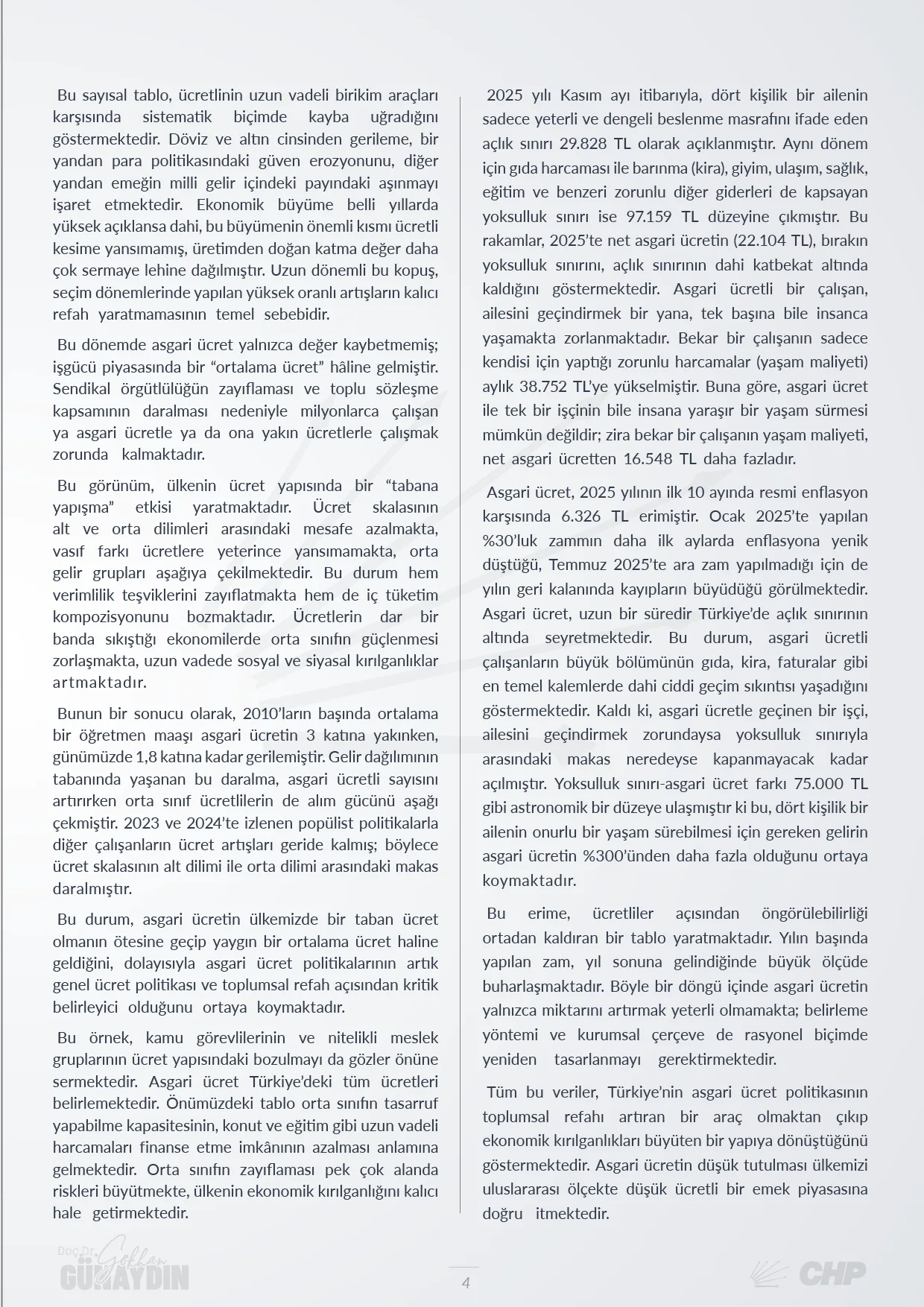 Teklifin genel gerekçesinde, AKP iktidarı döneminde asgari ücretin alım gücündeki erime çarpıcı verilerle ortaya konuldu. 2002 yılında bir asgari ücretle 1,53 Cumhuriyet altını alınabilirken, 2025 yılında bu oranın 0,61’e düştüğü belirtildi. Gerekçede, 2025 Kasım ayı itibarıyla açlık sınırının 29.828 TL, yoksulluk sınırının ise 97.159 TL olduğu vurgulanarak, mevcut 22.104 TL’lik asgari ücretin açlık sınırının dahi altında kaldığına dikkat çekildi. CHP, asgari ücretin artık bir “ortalama ücret” haline geldiğini ve orta sınıfın yok olduğunu belirtti.