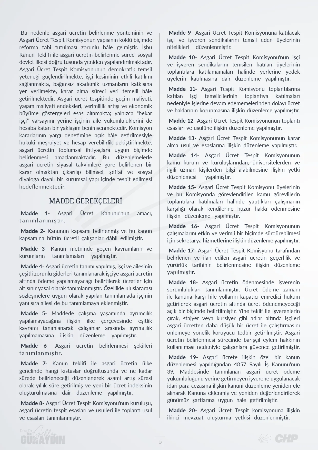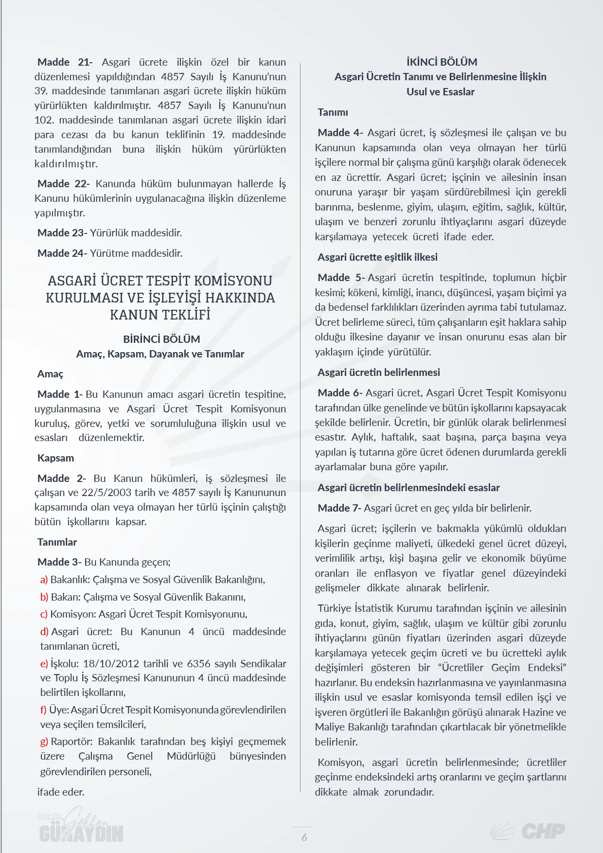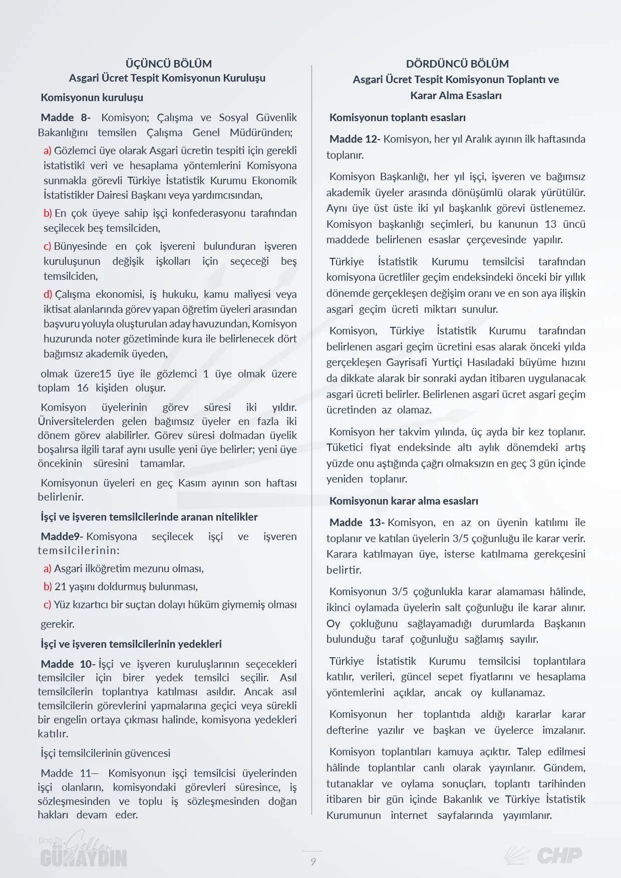 CHP tarafından TBMM'ye sunulan kanun teklifi, asgari ücretin işçi ve ailesinin geçimini sağlayacak düzeyde üç ayda bir belirlenmesini, komisyona bağımsız akademisyenlerin dahil edilmesini ve toplantıların canlı yayınlanmasını öngörüyor.