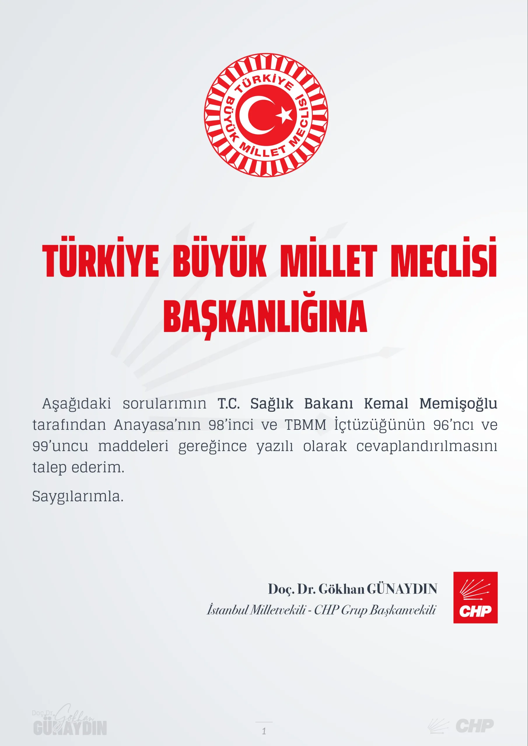 CHP Grup Başkanvekili Gökhan Günaydın, T.C. Sağlık Bakanı Kemal Memişoğlu’nun yanıtlaması istemiyle E-Nabız ile ilgili soru önergesini TBMM Başkanlığı’na sundu.