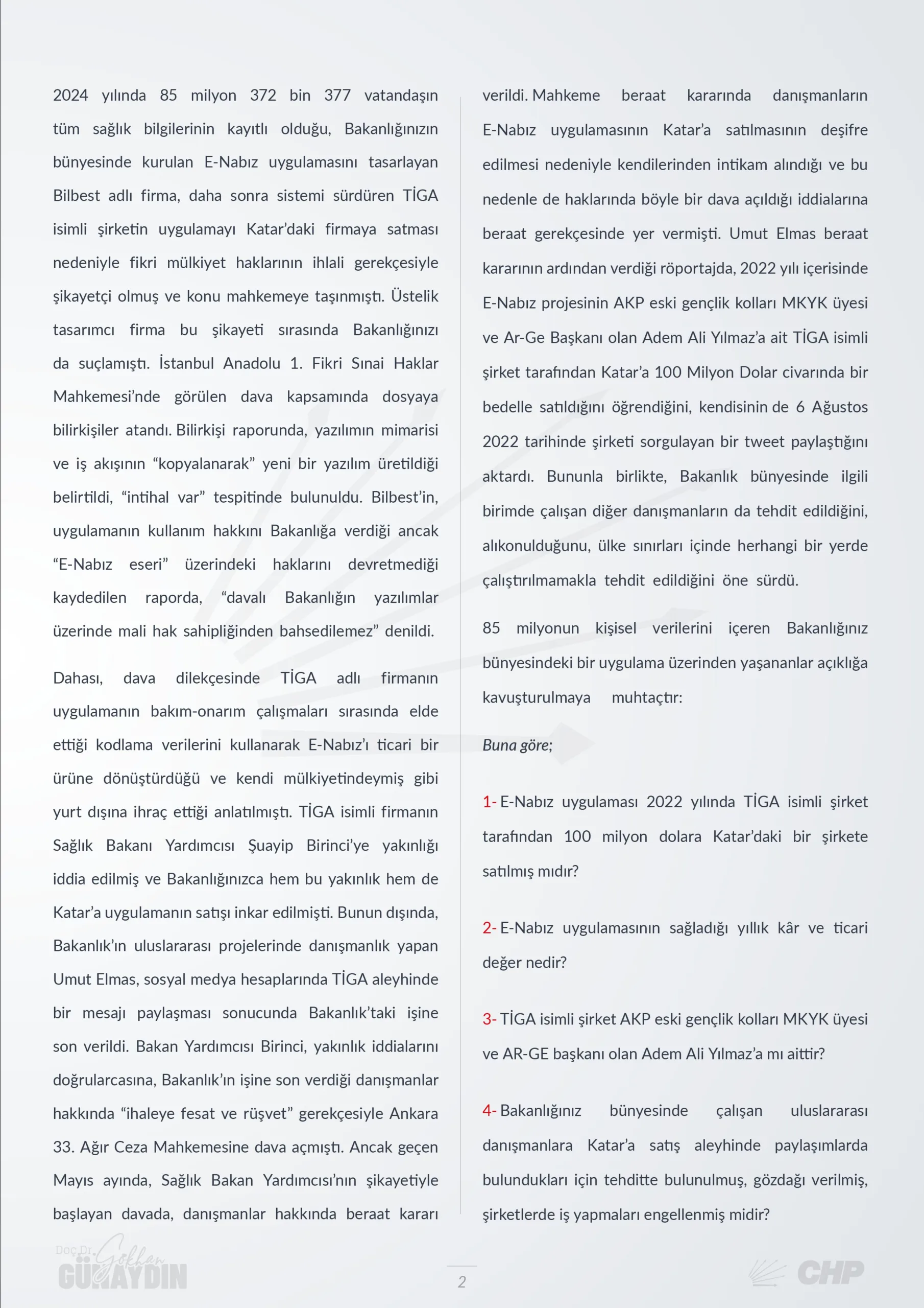 Cumhuriyet Halk Partisi Grup Başkanvekili Gökhan Günaydın, Sağlık Bakanı Kemal Memişoğlu’na verdiği E-Nabız ile ilgili soru önergesiyle 2024 yılında 85 milyon 372 bin 377 vatandaşın tüm sağlık bilgilerinin kayıtlı olduğu, Bakanlığınızın bünyesinde kurulan E-Nabız uygulamasını tasarlayan Bilbest adlı firma, daha sonra sistemi sürdüren TİGA isimli şirketin uygulamayı Katar’daki firmaya satması nedeniyle fikri mülkiyet haklarının ihlali gerekçesiyle şikayetçi olduğuna ve konunun mahkemeye taşındığına dikkat çeken CHP’li Günaydın, ‘E-Nabız uygulaması 2022 yılında TİGA isimli şirket tarafından 100 milyon dolara Katar’daki bir şirkete satılmış mıdır?’ sorusunu Sağlık Bakanı Kemal Memişoğlu’na soran Doç. Dr. Gökhan Günaydın, şunları dile getirdi;