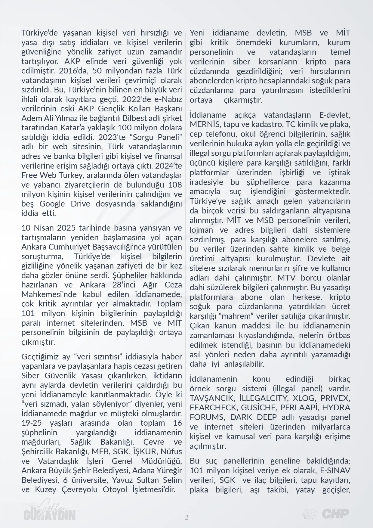 10 Nisan 2025 tarihinde basına yansıyan ve tartışmaların yeniden başlamasına yol açan Ankara Cumhuriyet Başsavcılığı’nca yürütülen soruşturma, Türkiye’de kişisel bilgilerin gizliliğine yönelik yaşanan zafiyeti de bir kez daha gözler önüne serdi. Şüpheliler hakkında hazırlanan ve Ankara 28’inci Ağır Ceza Mahkemesi’nde kabul edilen iddianamede, çok kritik ayrıntılar yer almaktadır. Toplam 101 milyon kişinin bilgilerinin paylaşıldığı paralı internet sitelerinden, MSB ve MİT personelinin bilgisinin de paylaşıldığı ortaya çıkmıştır.