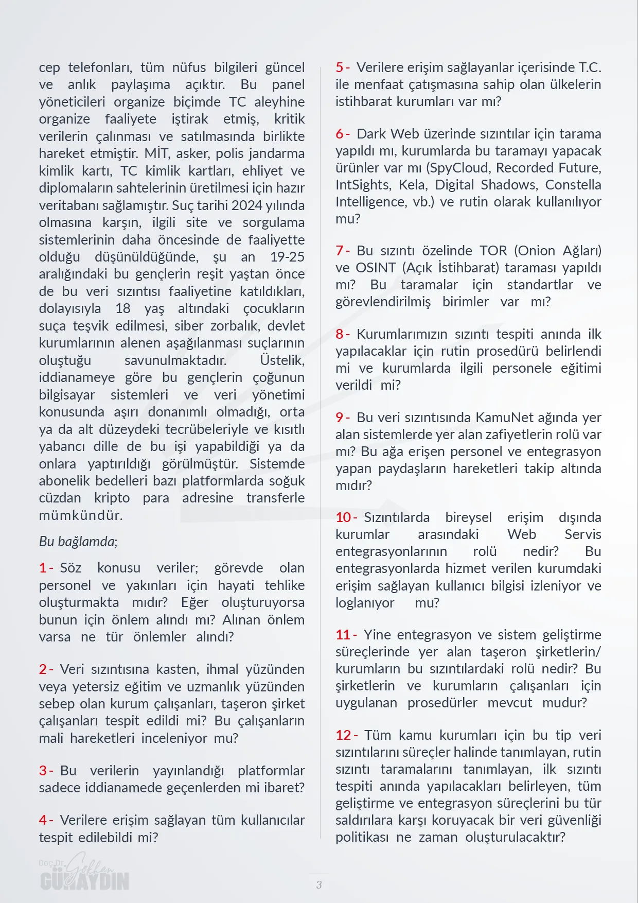 Cumhuriyet Halk Partisi Grup Başkanvekili Gökhan Günaydın, T.C. İçişleri Bakanı Ali Yerlikaya’ya verdiği kişisel veri hırsızlığı ile ilgili soru önergesiyle şuna dikkat çekti; “Türkiye’de yaşanan kişisel veri hırsızlığı ve yasa dışı satış iddiaları ve kişisel verilerin güvenliğine yönelik zafiyet uzun zamandır tartışılıyor. AKP elinde veri güvenliği yok edilmiştir. 2016’da, 50 milyondan fazla Türk vatandaşının kişisel verileri çevrimiçi olarak sızdırıldı.”