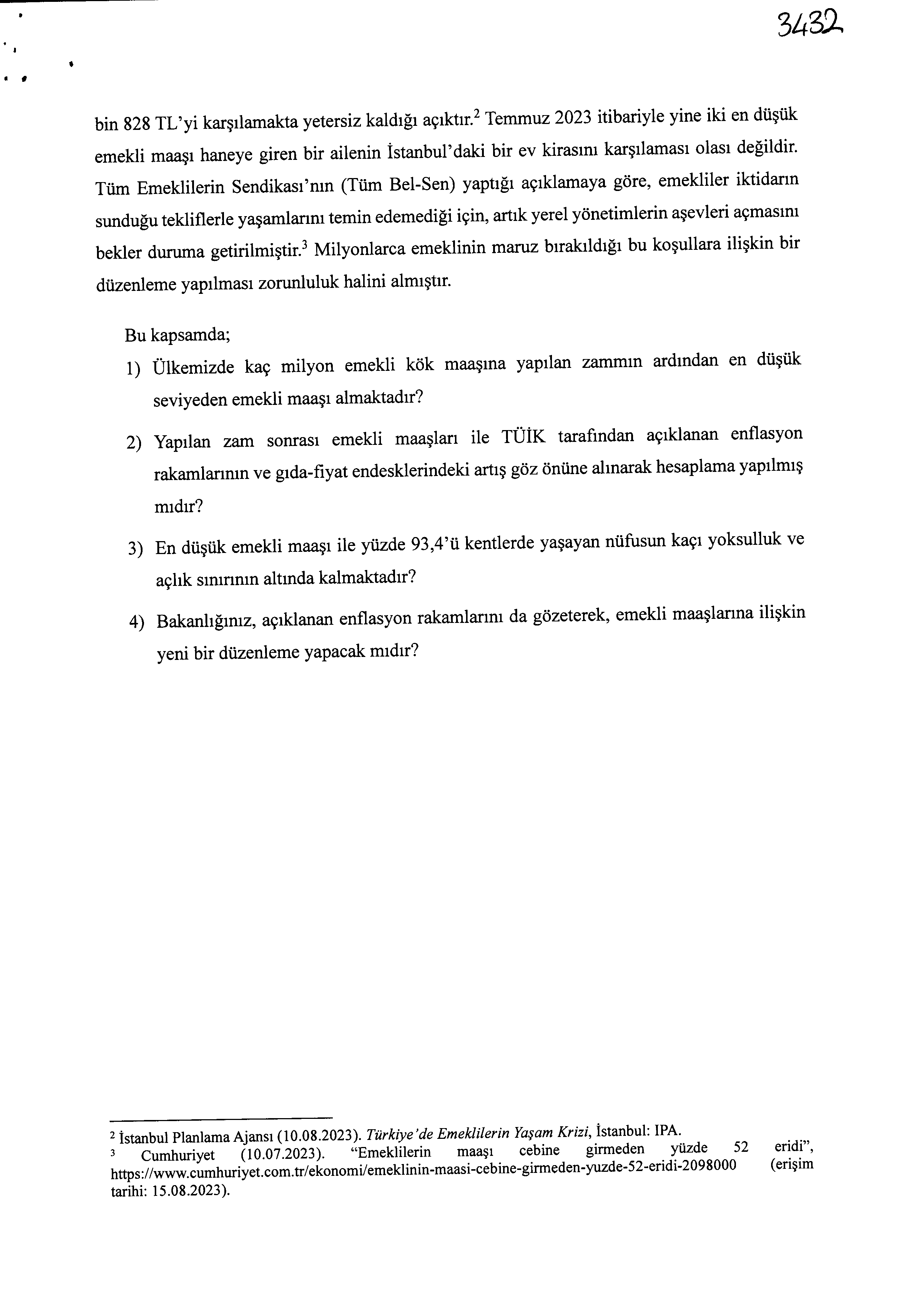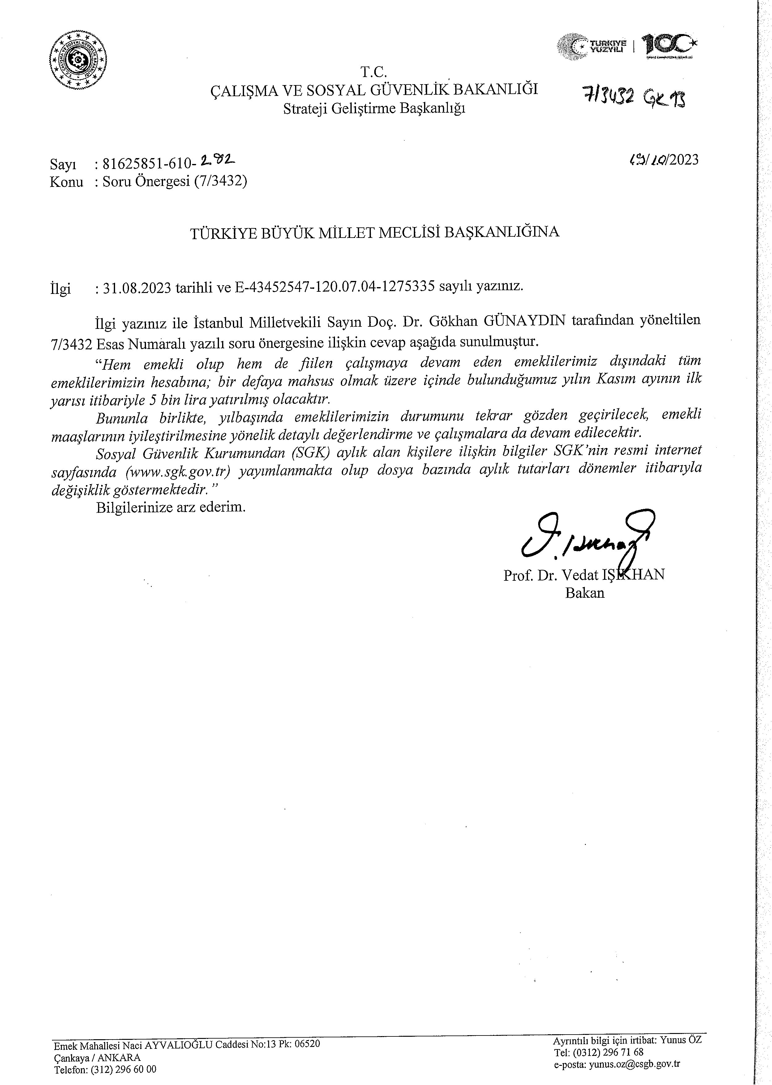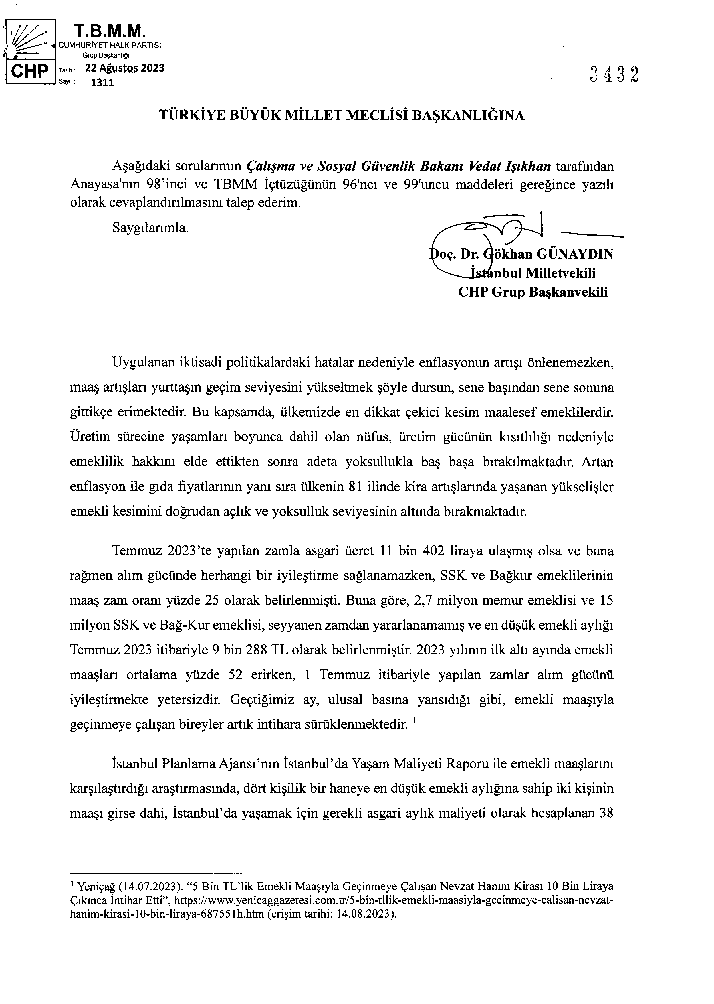 T.C. Çalışma ve Sosyal Güvenlik Bakanı Vedat Işıkhan tarafından Anayasa’nın 98’inci ve TBMM İçtüzüğünün 96’ncı ve 99’uncu maddeleri gereğince yazılı olarak cevaplandırılmasını talep ettiğim soru önergemizi bilgilerinize sunarım. 22.08.2023