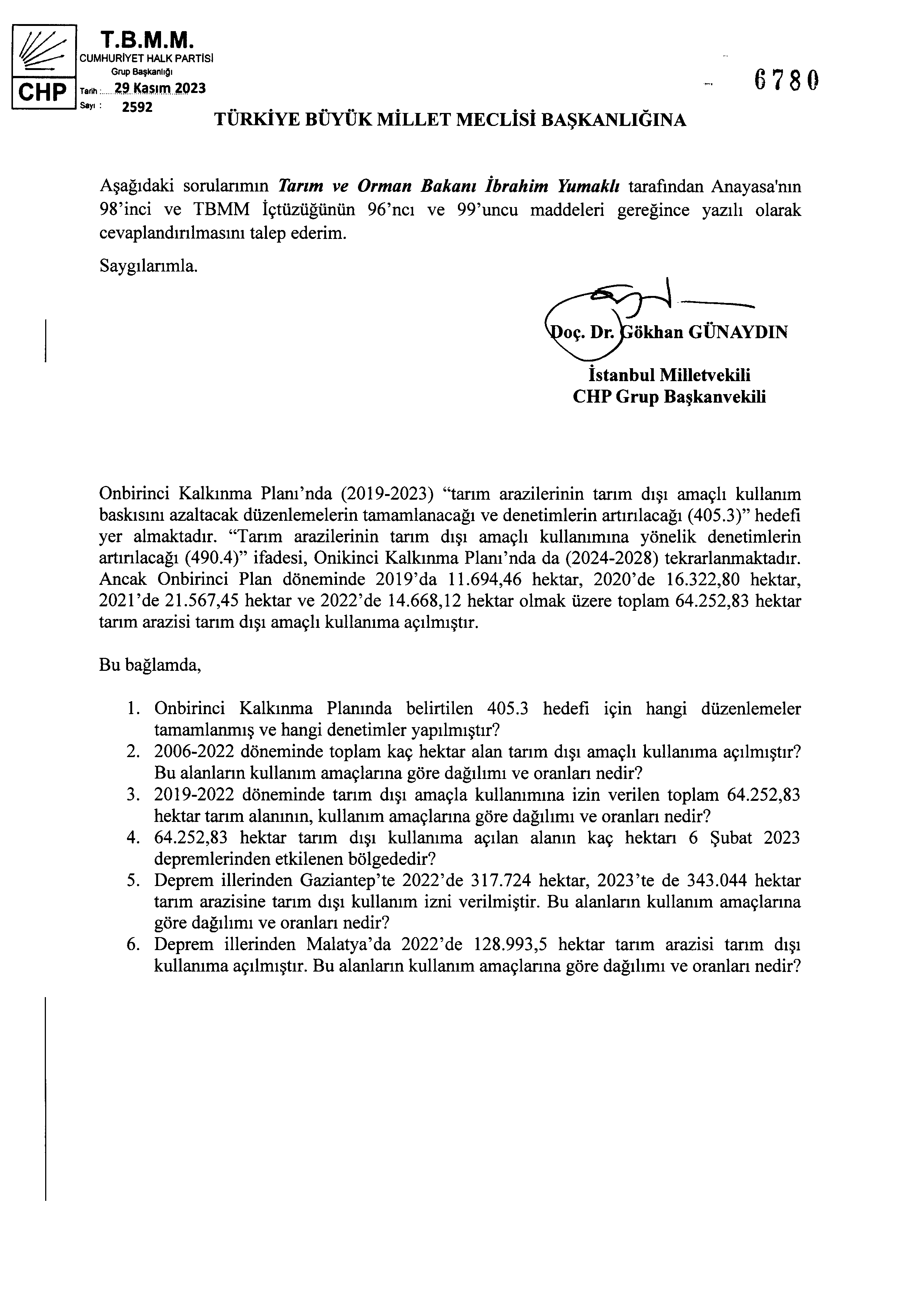 T.C. Tarım ve Orman Bakanı Sayın İbrahim Yumaklı tarafından Anayasa’nın 98’inci ve TBMM İçtüzüğünün 96’ncı ve 99’uncu maddeleri gereğince yazılı olarak cevaplandırılmasını talep ettiğim soru önergemizi bilgileriniz sunarım. 29.11.2023