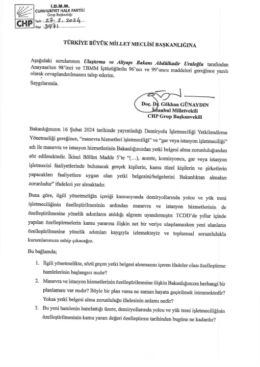 T.C. Ulaştırma ve Altyapı Bakanı Abdulkadir Uraloğlu tarafından Anayasa’nın 98’inci ve TBMM İçtüzüğünün 96’ncı ve 99’uncu maddeleri gereğince yazılı olarak cevaplandırılmasını talep ettiğim soru önergemizi bilgilerinize sunarım. 27.02.2024
