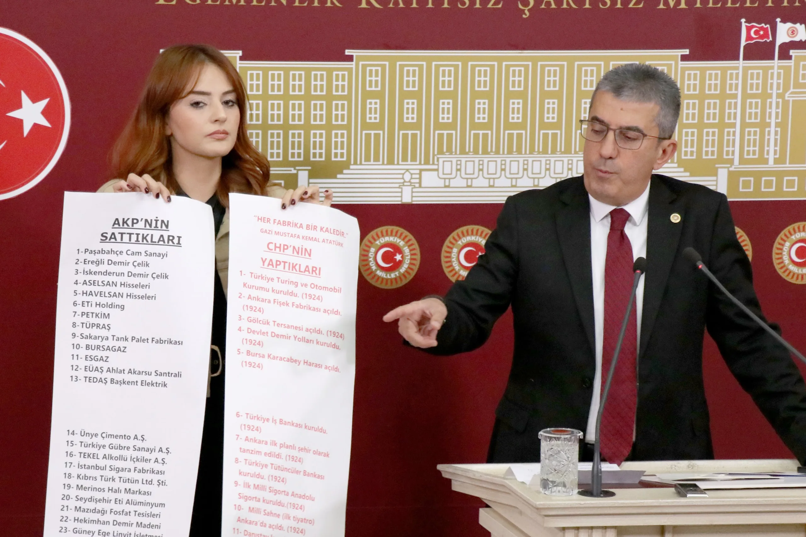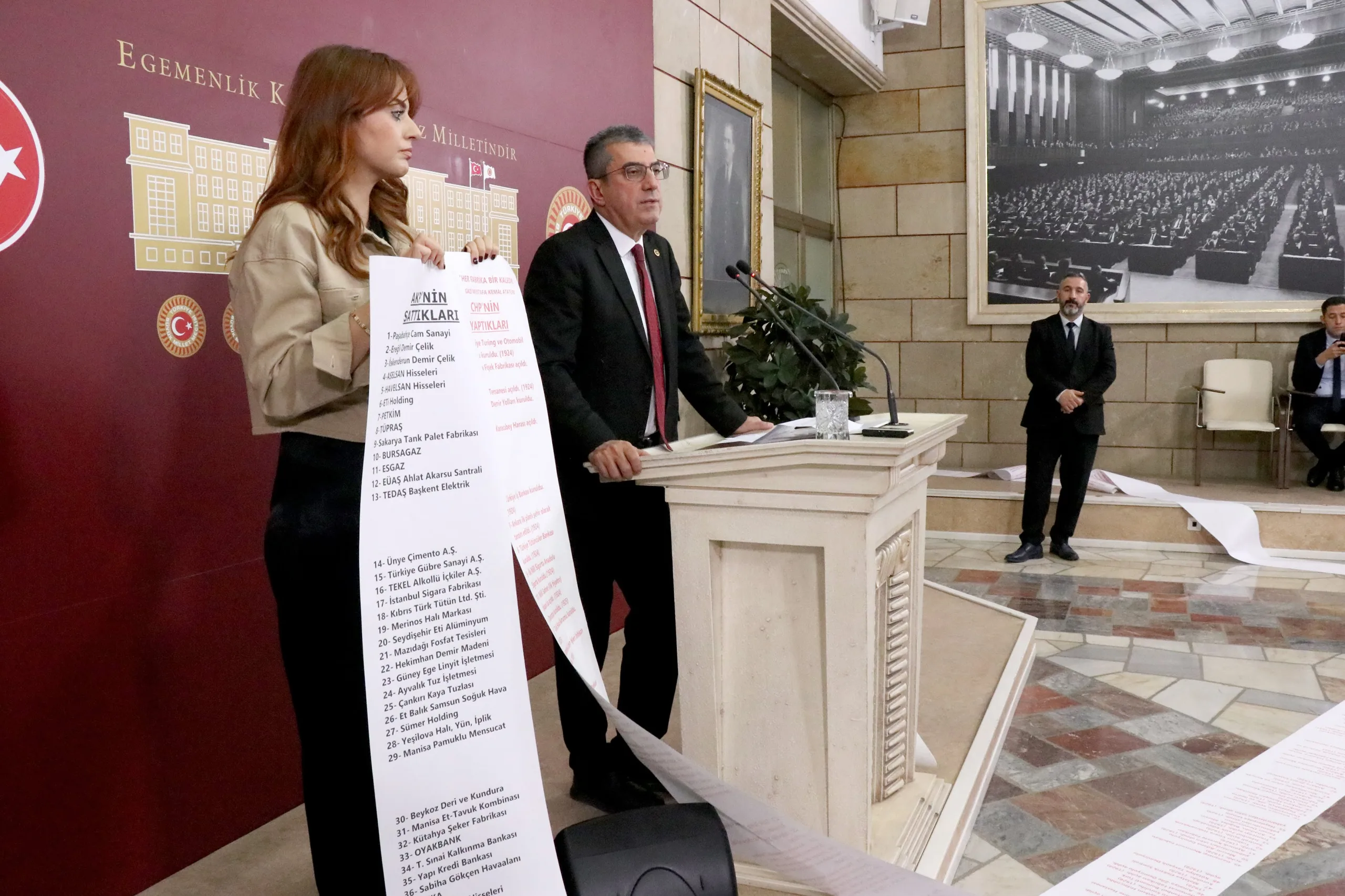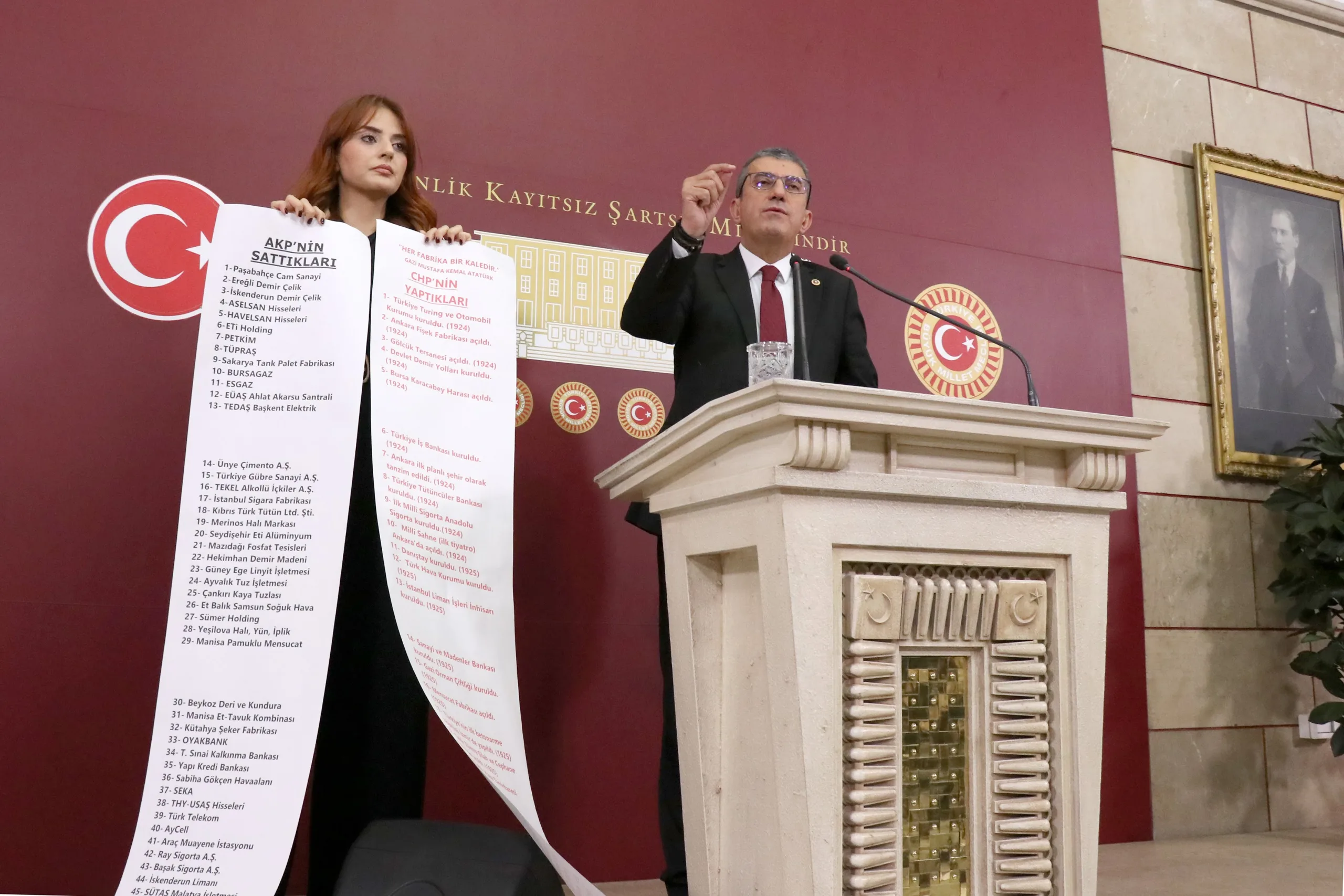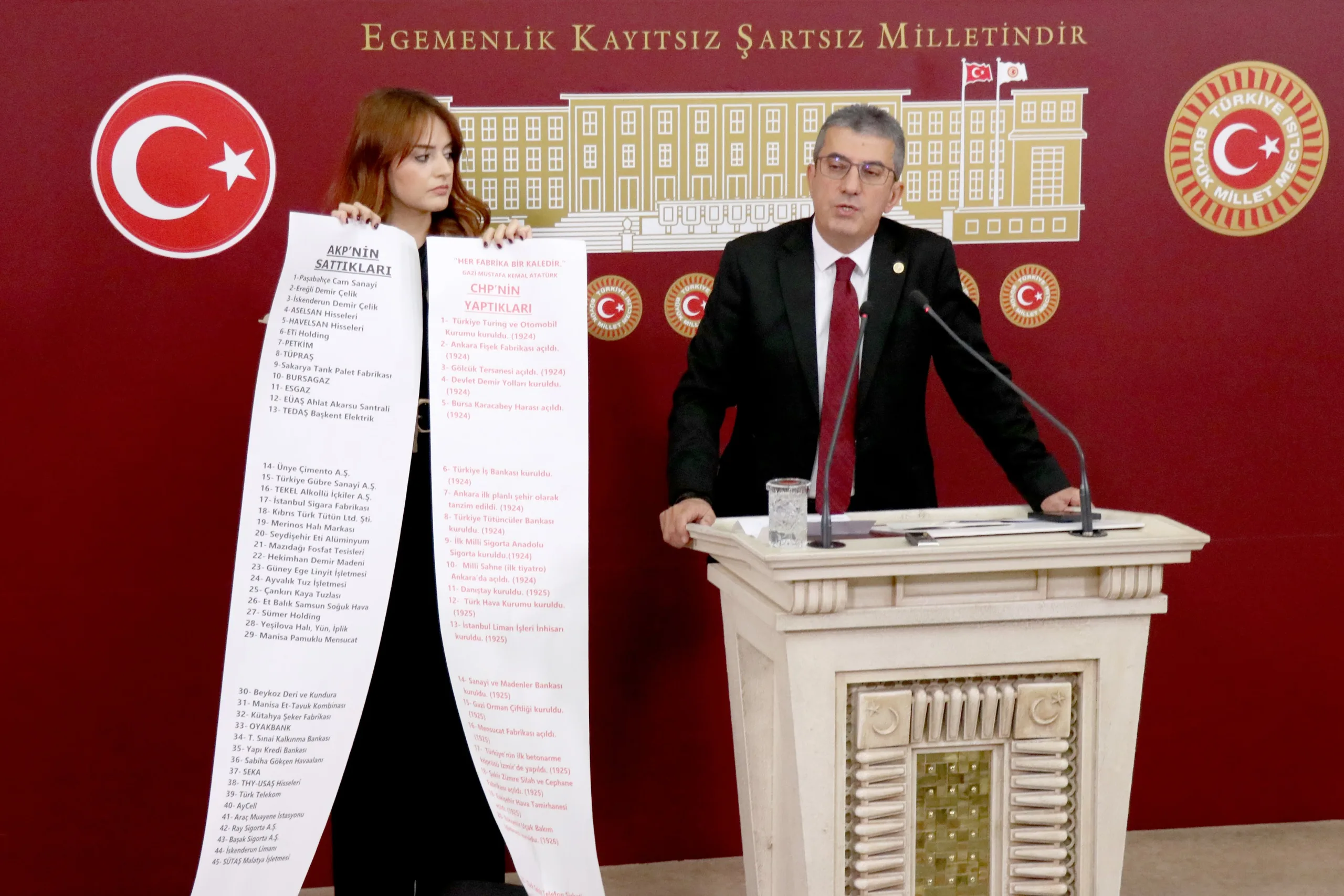 Peki AKP ne yaptı, bir de ona bakalım. Hani Türkiye Yüzyılı filminde Anıtkabir’i göstermiyorlar ve adeta tarihi 2002’den itibaren başlatıyorlar ya; bir de onlar ne yapmış bakalım. İşte bunlar arkadaşlar Cumhuriyet’in en zor zamanlarında yapılıp da AKP tarafından satılan fabrikaların listesidir. Cumhuriyet Halk Partisi’nin bu memlekette bir dikili ağacı yok diyenlere en iyi cevabı bu iki rulo gösteriyor; kırmızıyla yazılanlar CHP’nin bu memleketteki dikili ağaçlarını, siyah puntolarla yazılanlar da bu dikili ağaçların AKP tarafından nasıl söküldüğünün, nasıl peşkeş çekildiğinin fotoğrafıdır.
