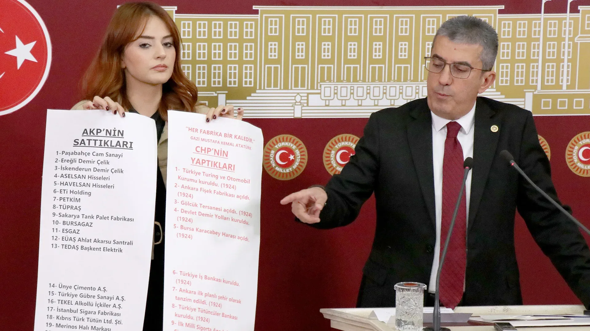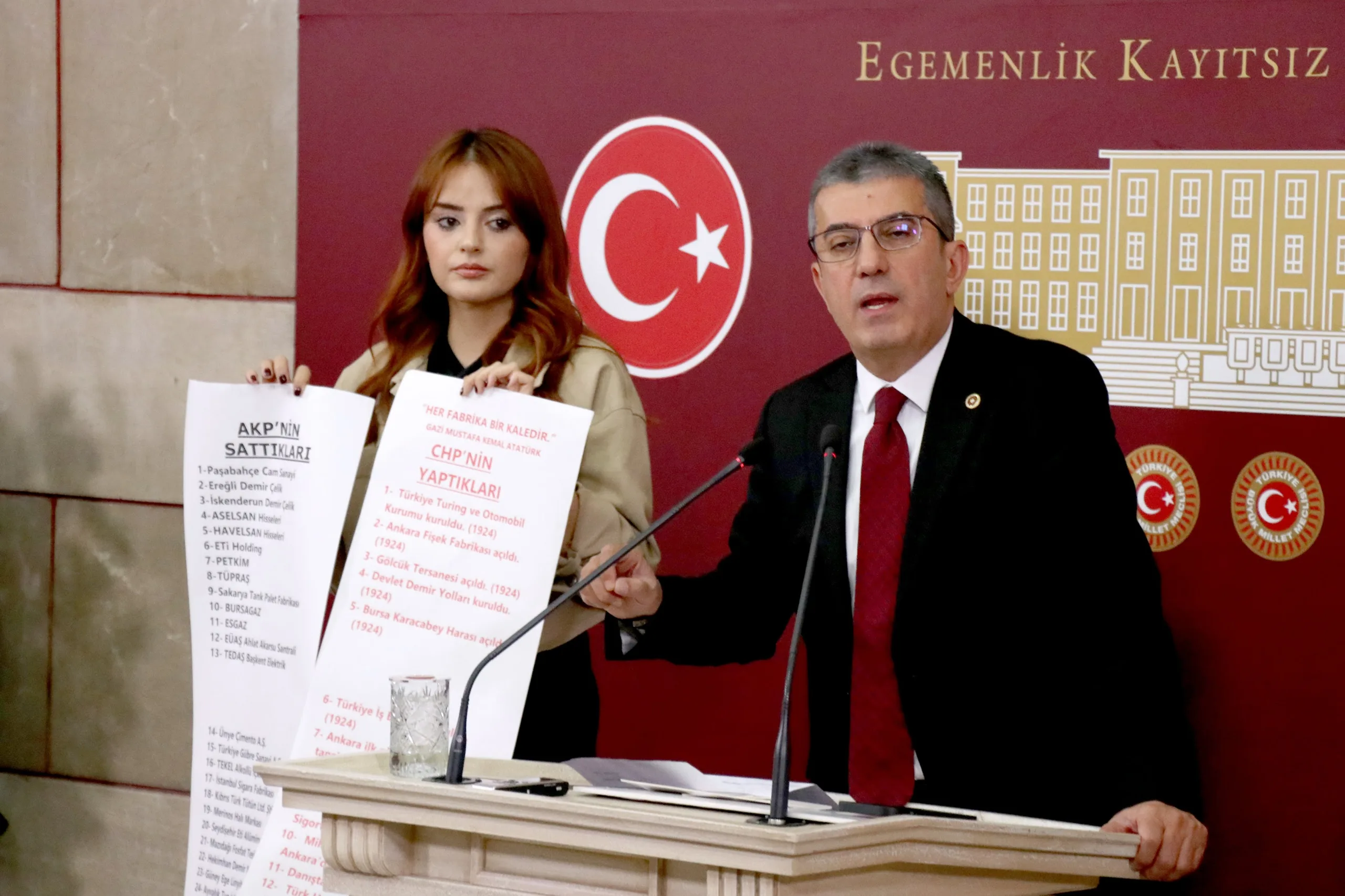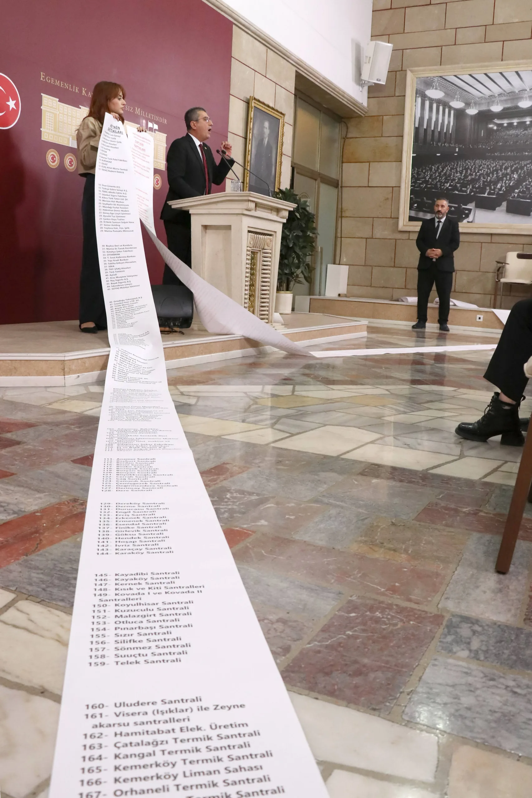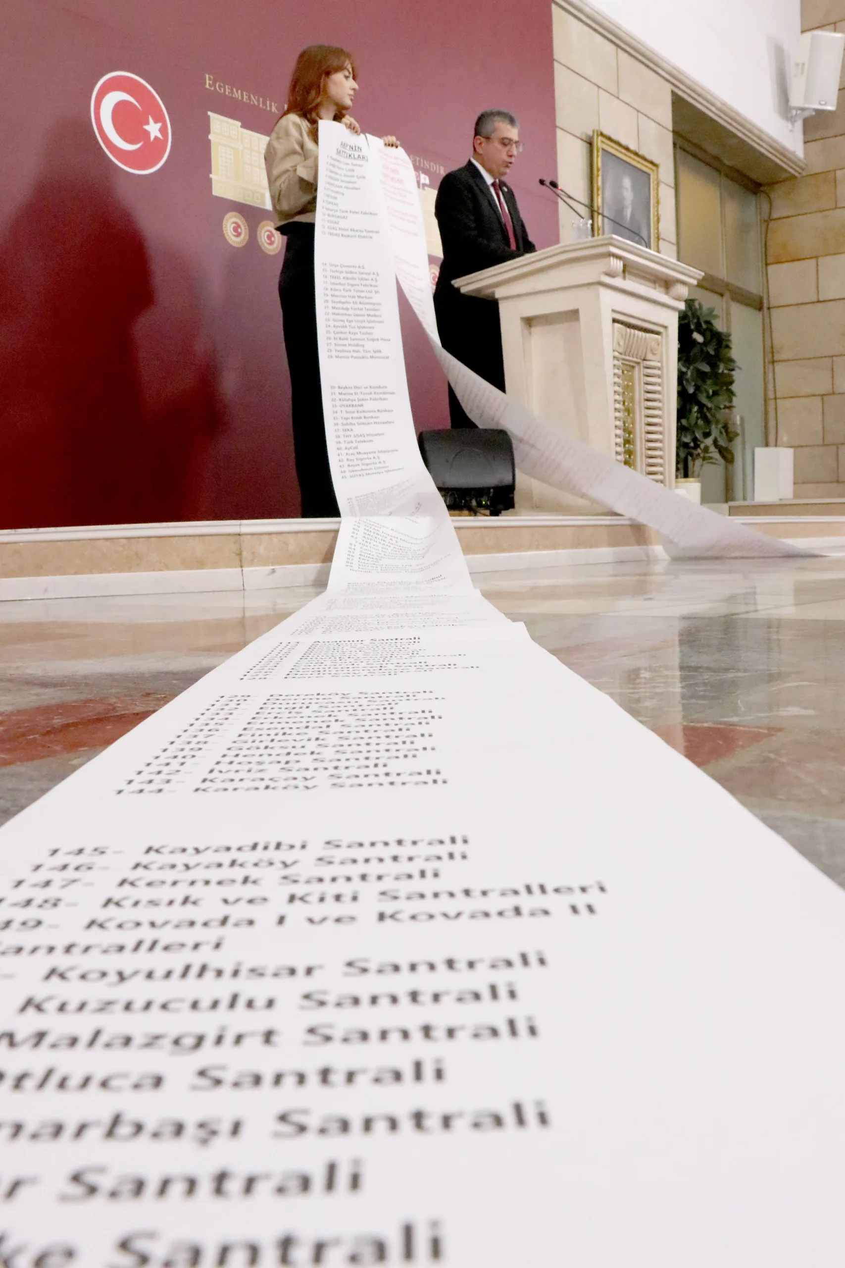 Peki AKP ne yaptı, bir de ona bakalım. Hani Türkiye Yüzyılı filminde Anıtkabir’i göstermiyorlar ve adeta tarihi 2002’den itibaren başlatıyorlar ya; bir de onlar ne yapmış bakalım. İşte bunlar arkadaşlar Cumhuriyet’in en zor zamanlarında yapılıp da AKP tarafından satılan fabrikaların listesidir. Cumhuriyet Halk Partisi’nin bu memlekette bir dikili ağacı yok diyenlere en iyi cevabı bu iki rulo gösteriyor; kırmızıyla yazılanlar CHP’nin bu memleketteki dikili ağaçlarını, siyah puntolarla yazılanlar da bu dikili ağaçların AKP tarafından nasıl söküldüğünün, nasıl peşkeş çekildiğinin fotoğrafıdır.