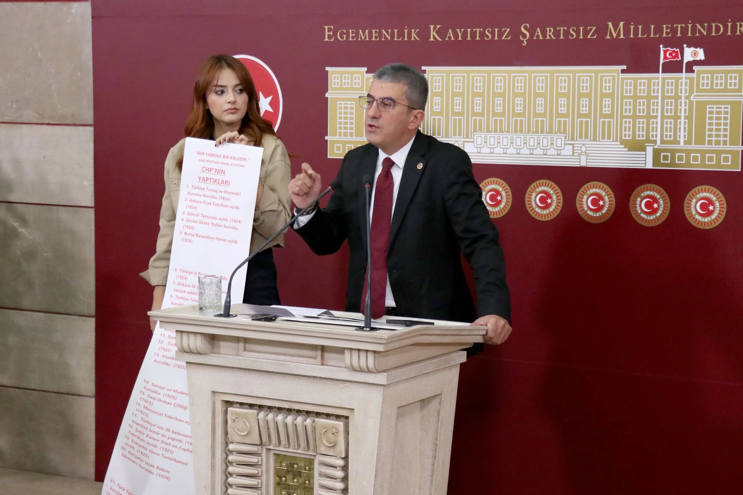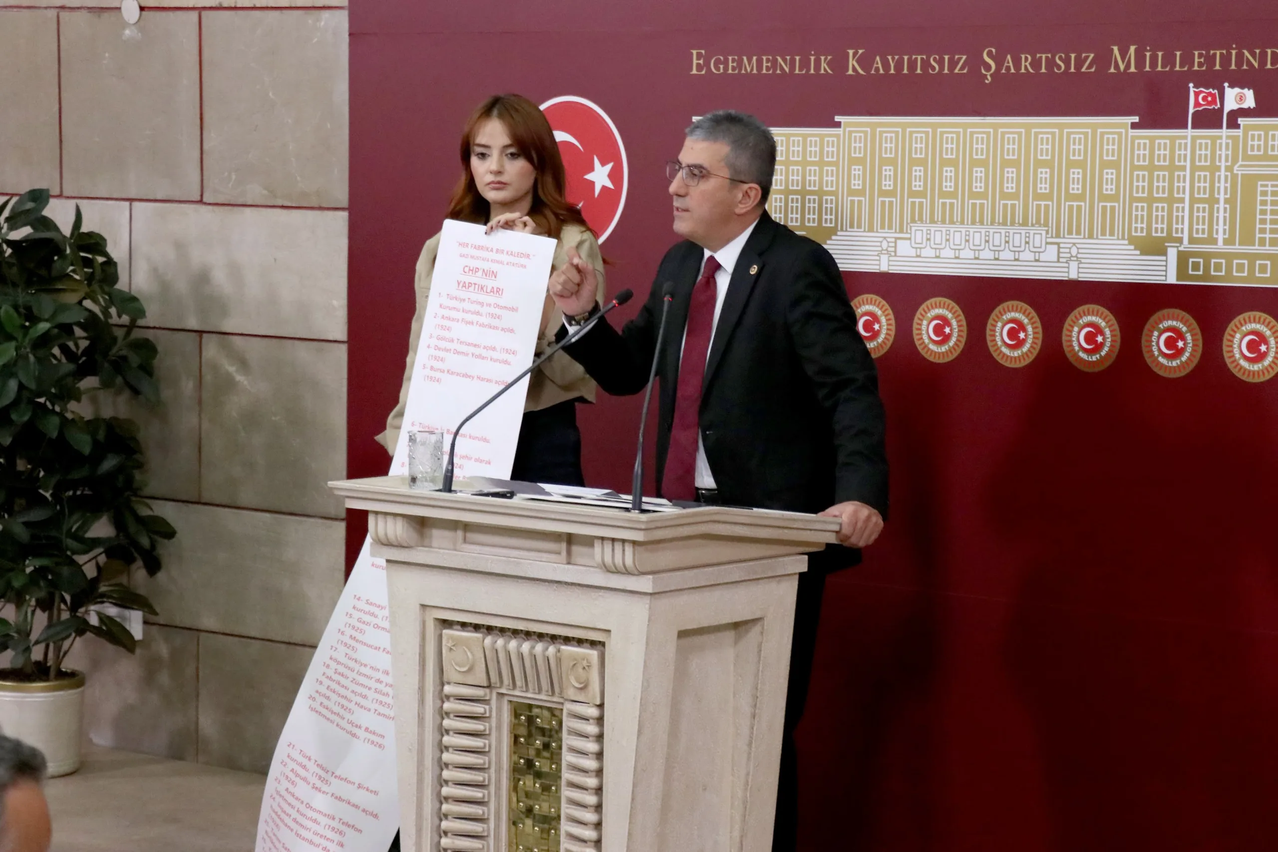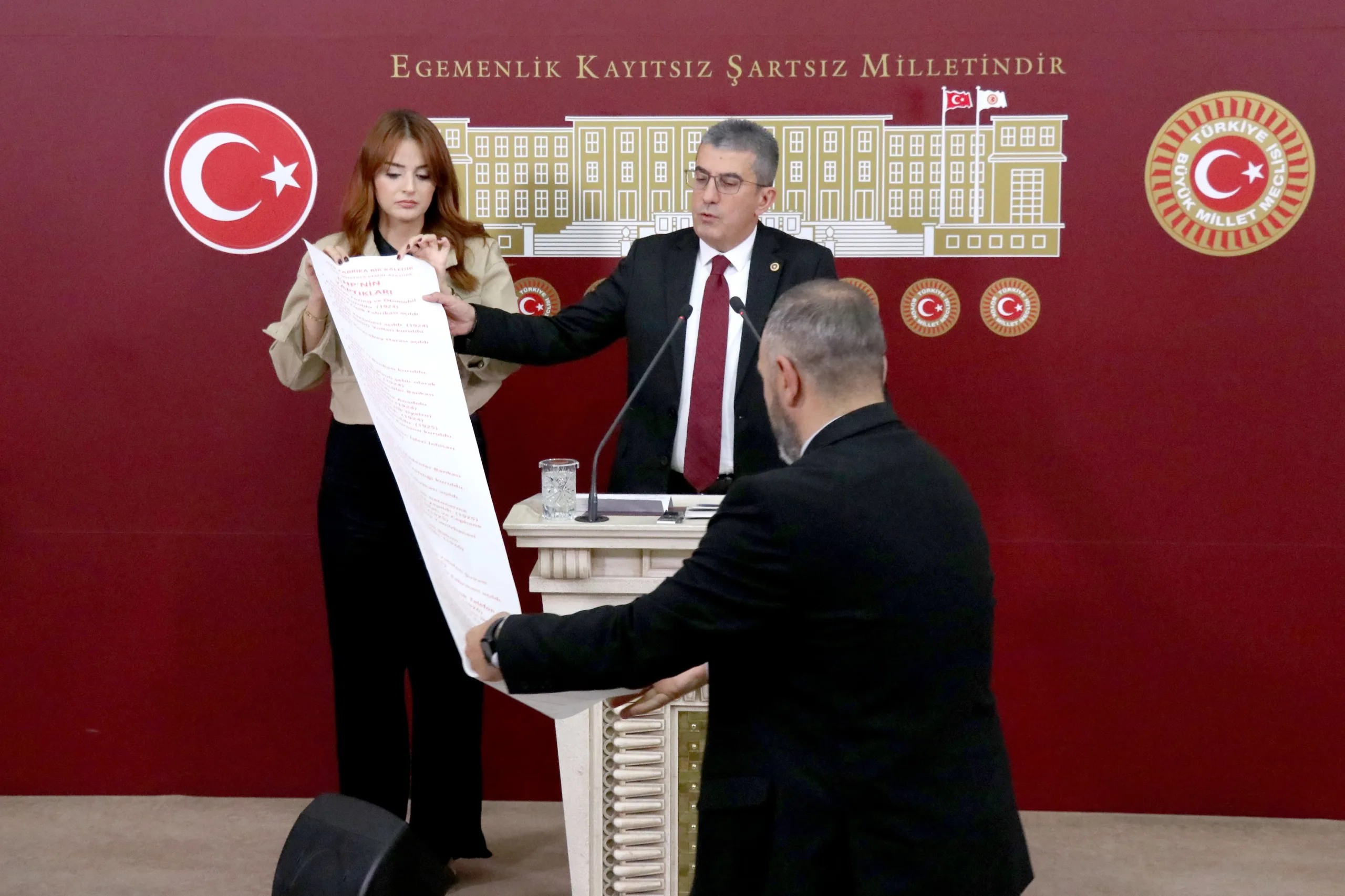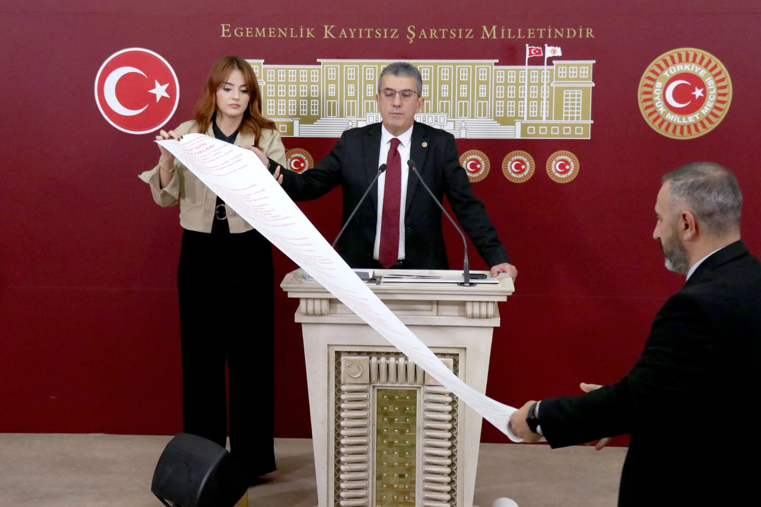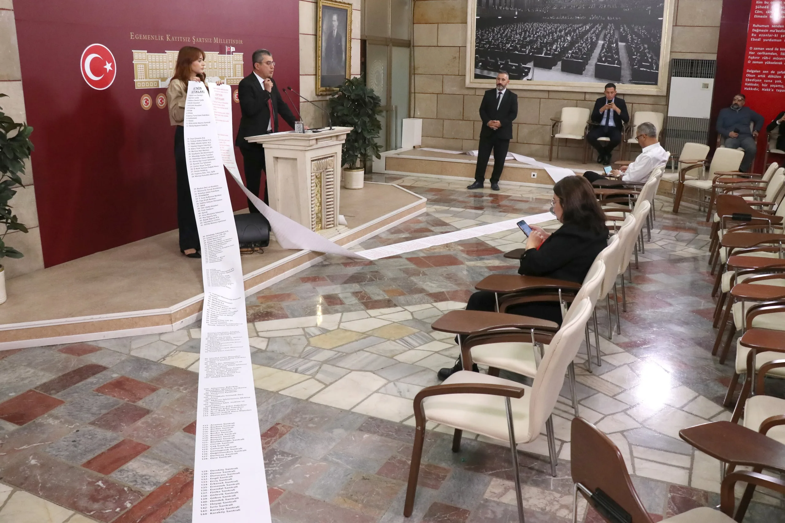 Peki AKP ne yaptı, bir de ona bakalım. Hani Türkiye Yüzyılı filminde Anıtkabir’i göstermiyorlar ve adeta tarihi 2002’den itibaren başlatıyorlar ya; bir de onlar ne yapmış bakalım. İşte bunlar arkadaşlar Cumhuriyet’in en zor zamanlarında yapılıp da AKP tarafından satılan fabrikaların listesidir. Cumhuriyet Halk Partisi’nin bu memlekette bir dikili ağacı yok diyenlere en iyi cevabı bu iki rulo gösteriyor; kırmızıyla yazılanlar CHP’nin bu memleketteki dikili ağaçlarını, siyah puntolarla yazılanlar da bu dikili ağaçların AKP tarafından nasıl söküldüğünün, nasıl peşkeş çekildiğinin fotoğrafıdır.
