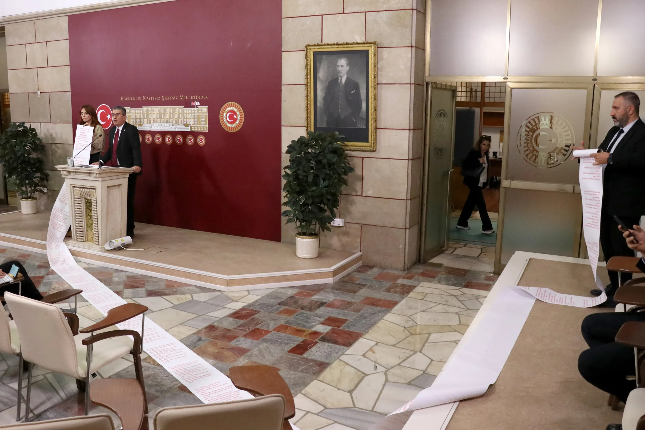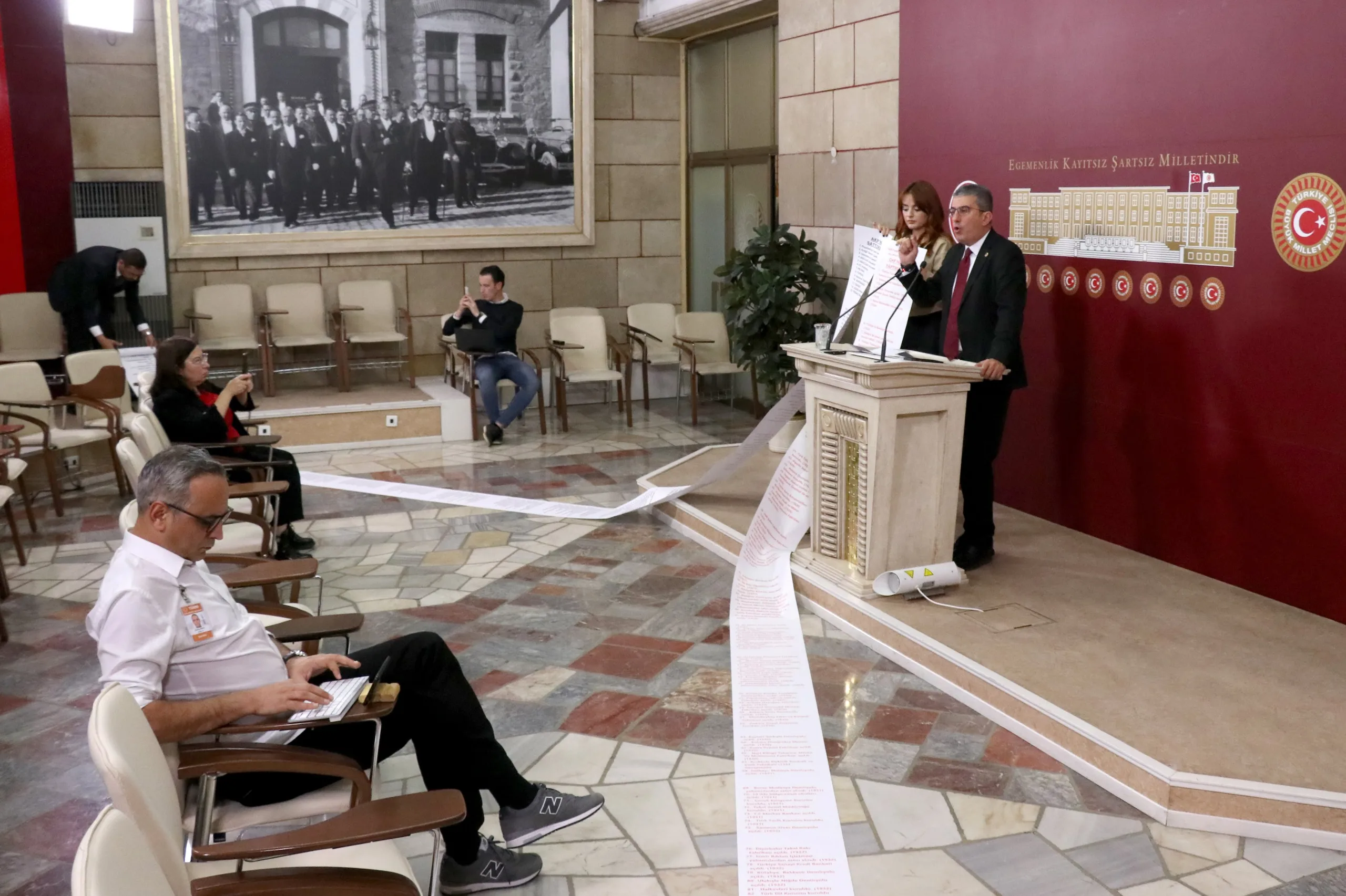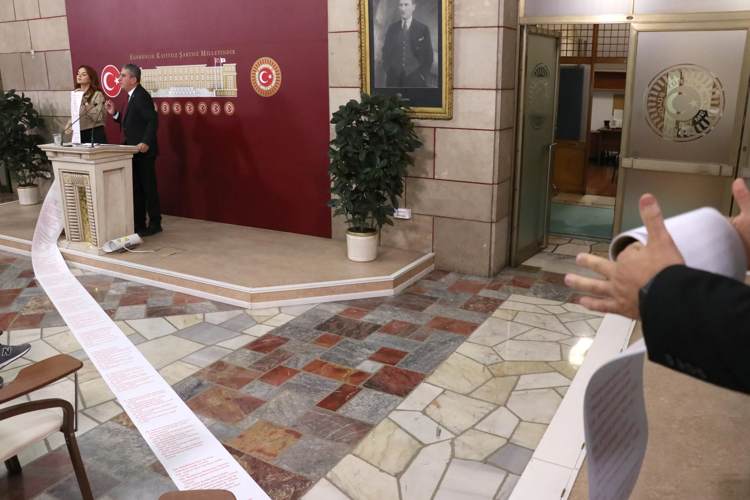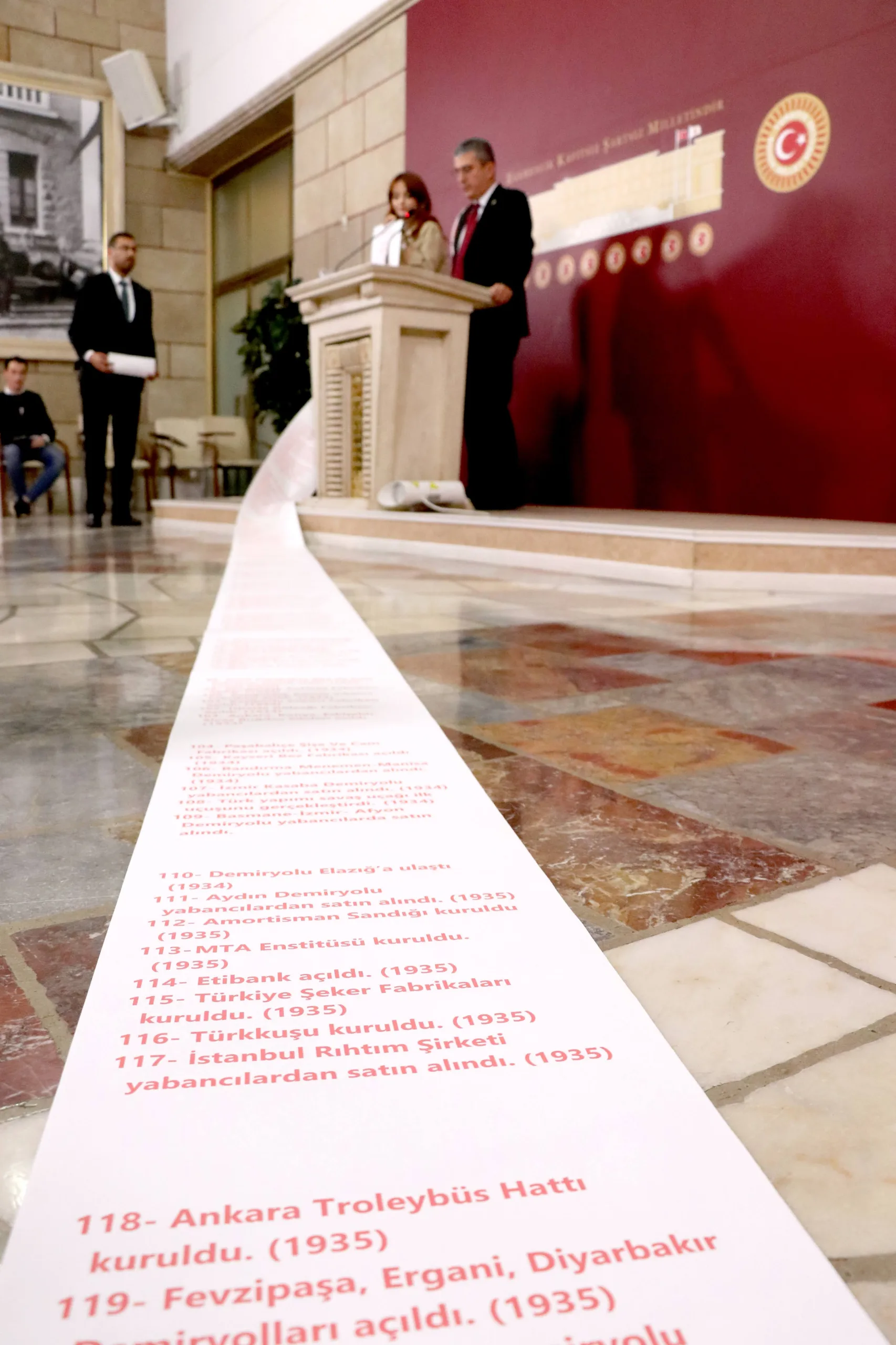 Peki AKP ne yaptı, bir de ona bakalım. Hani Türkiye Yüzyılı filminde Anıtkabir’i göstermiyorlar ve adeta tarihi 2002’den itibaren başlatıyorlar ya; bir de onlar ne yapmış bakalım. İşte bunlar arkadaşlar Cumhuriyet’in en zor zamanlarında yapılıp da AKP tarafından satılan fabrikaların listesidir. Cumhuriyet Halk Partisi’nin bu memlekette bir dikili ağacı yok diyenlere en iyi cevabı bu iki rulo gösteriyor; kırmızıyla yazılanlar CHP’nin bu memleketteki dikili ağaçlarını, siyah puntolarla yazılanlar da bu dikili ağaçların AKP tarafından nasıl söküldüğünün, nasıl peşkeş çekildiğinin fotoğrafıdır.