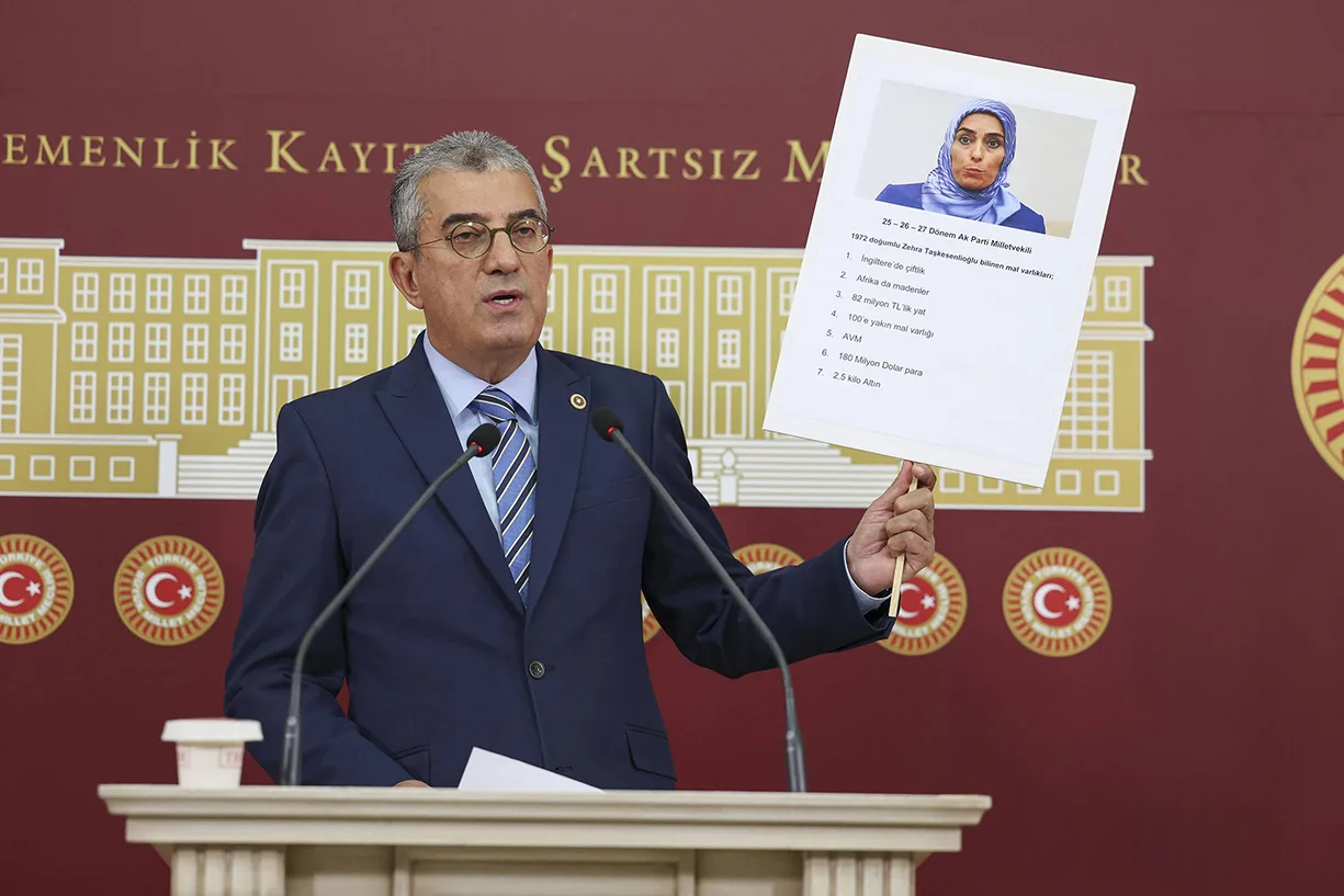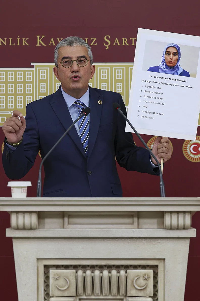 Bakın burada Zehra Taşkesenlioğlu’nun bilinen bir fotoğrafı var. Bir kere daha gösteriyorum. 1972 doğumlu. 25, 26, 27’nci Dönemde üç dönem milletvekilliği yapmış. Nasıl bir zeka küpü ki bu kadın İngiltere’de çiftliği, Afrika’da madenleri, 82 milyon TL’lik yatı, 100’e yakın mal varlığı, AVM’leri, 180 milyon dolar parası ve 2,5 kilo altını var. Ben bir kere daha soruyorum: Zehra Taşkesenlioğlu nasıl bir zeka küpü ki, fani yaşamında böylesine büyük bir serveti elde etmiş?