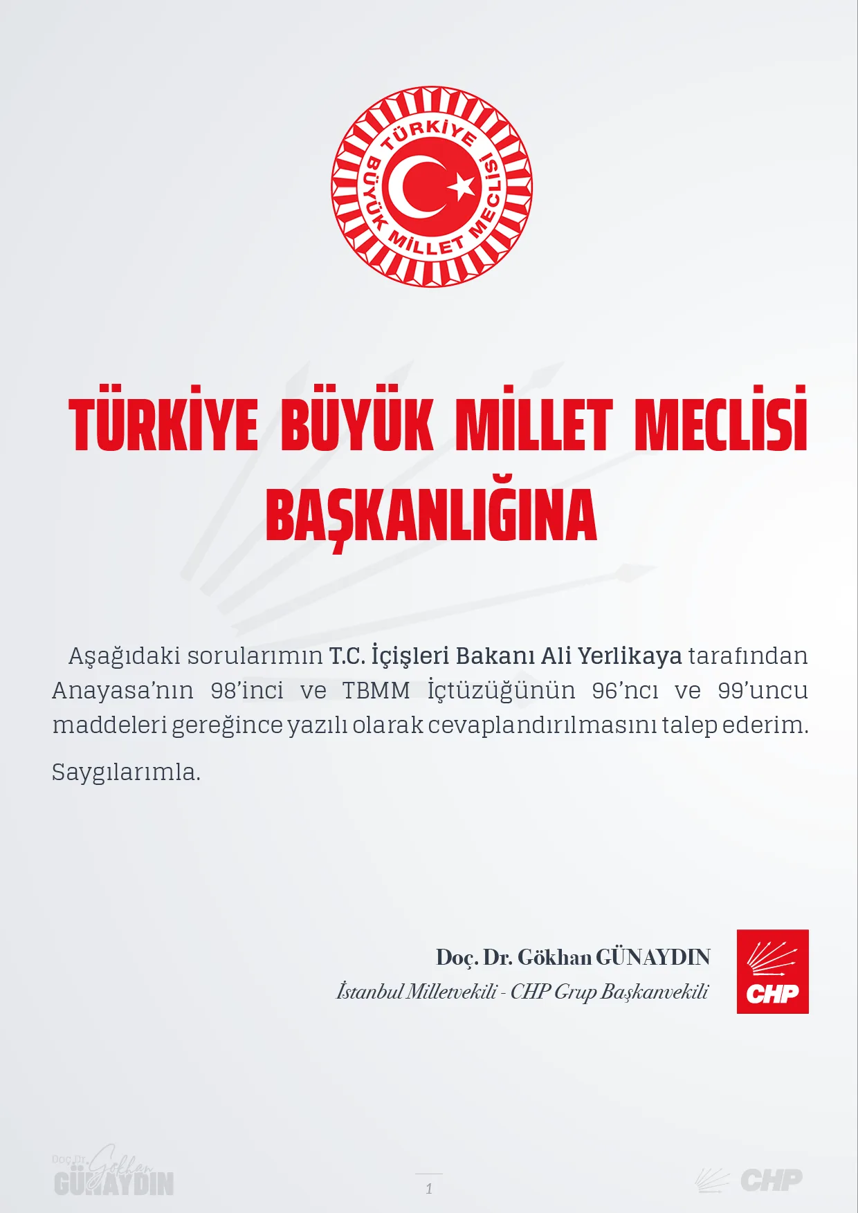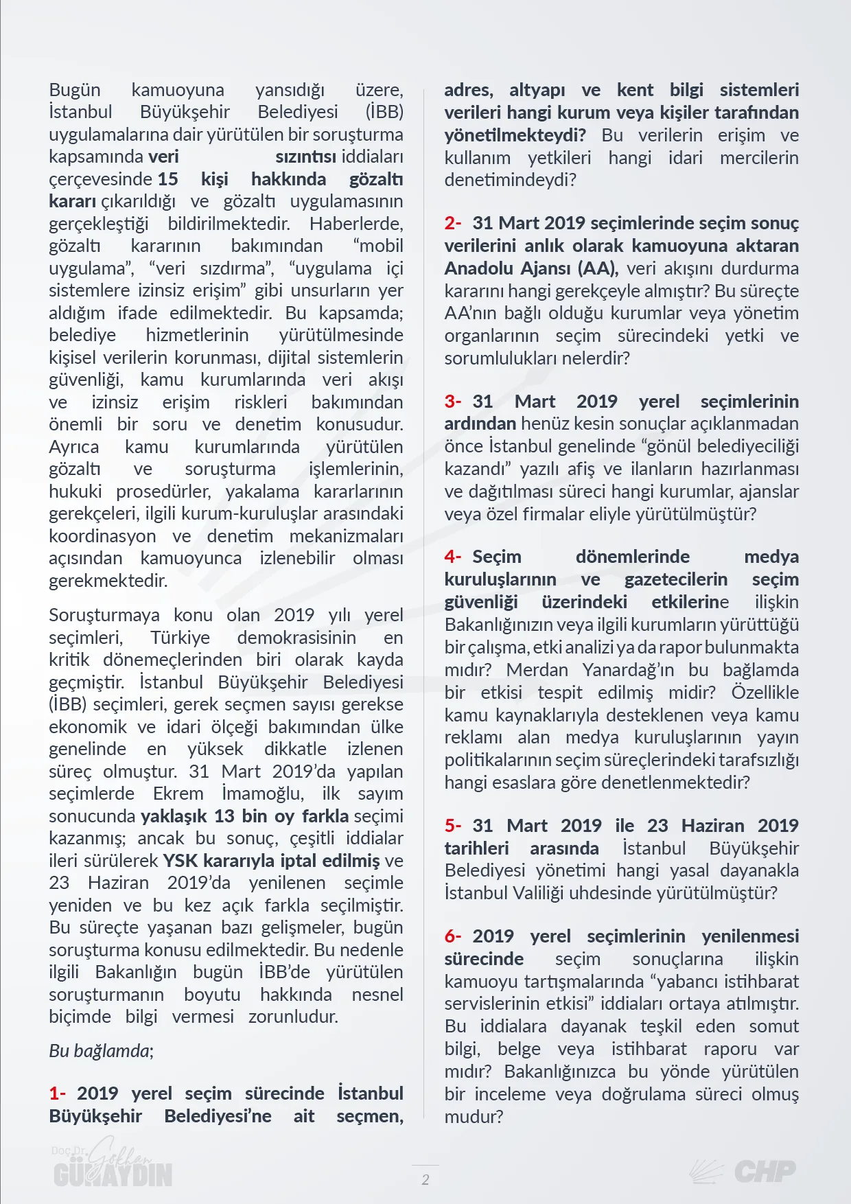 Cumhuriyet Halk Partisi (CHP) Grup Başkanvekili Gökhan Günaydın, İstanbul Büyükşehir Belediyesi (İBB) uygulamalarına yönelik yürütülen soruşturma kapsamında 15 kişinin gözaltına alınmasının ardından İçişleri Bakanı Ali Yerlikaya’nın yanıtlaması istemiyle Türkiye Büyük Millet Meclisi (TBMM) Başkanlığı’na kapsamlı bir soru önergesi sundu. Günaydın, önergesinde güncel soruşturmanın yanı sıra 31 Mart 2019 seçimlerinde yaşanan veri akışı kesintilerine ve “Gönül Belediyeciliği Kazandı” pankartlarına dikkat çekti.